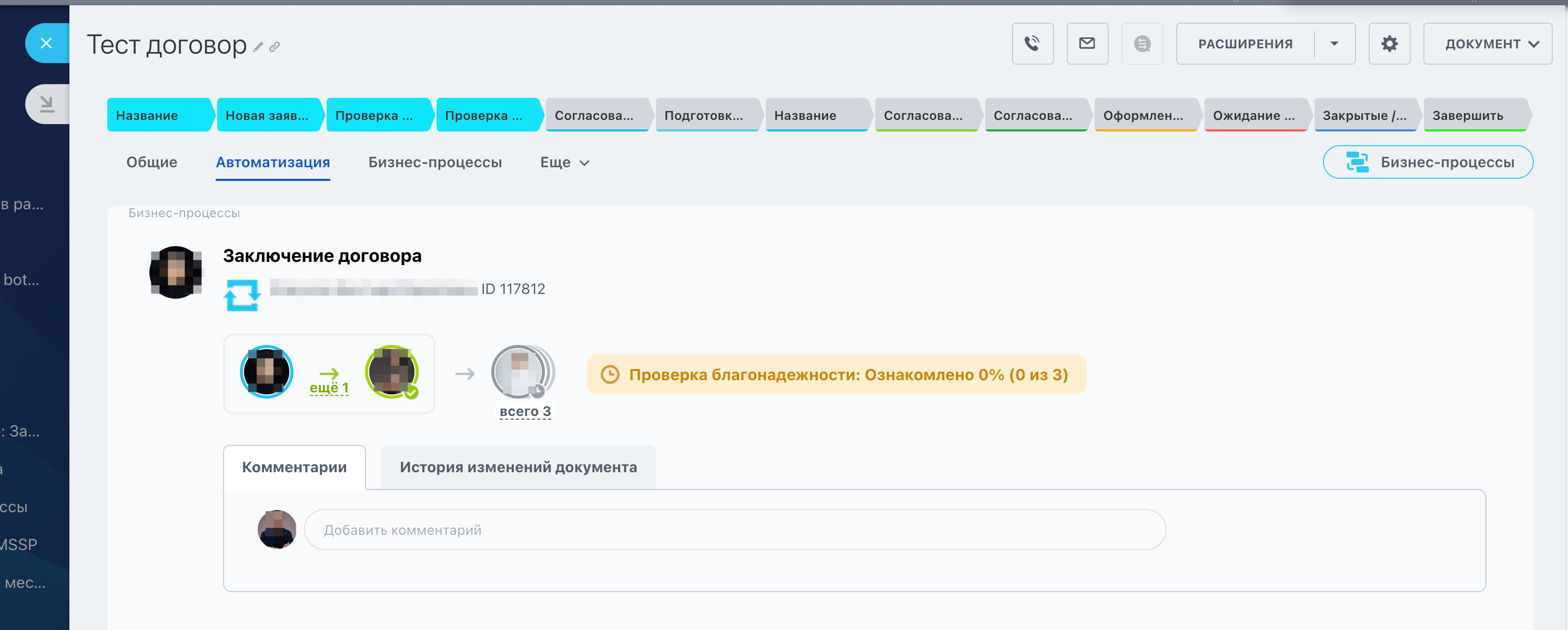 После создания договора автоматически запускается бизнес-процесс на согласование: