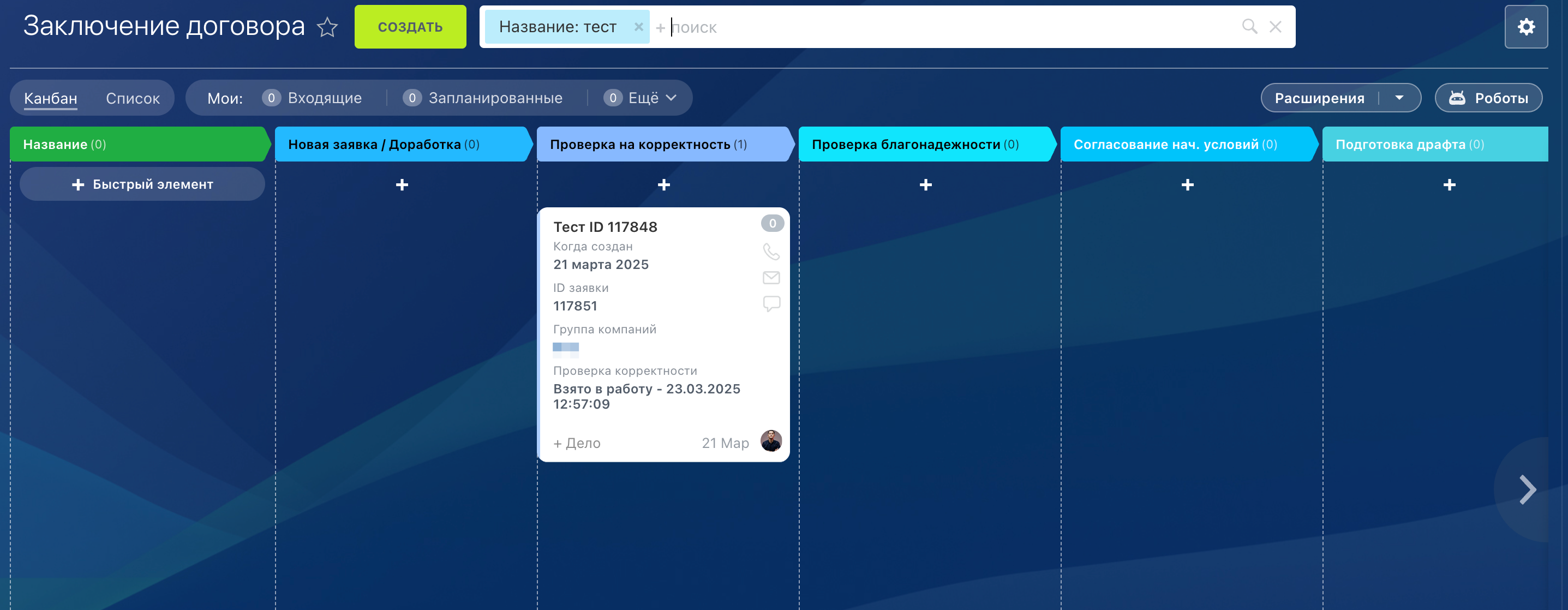 1.Процесс запускается вручную в разделе Автоматизация, либо из карточки компании (контрагента).